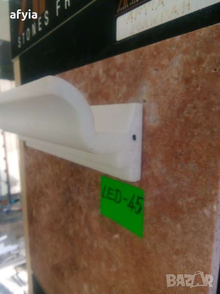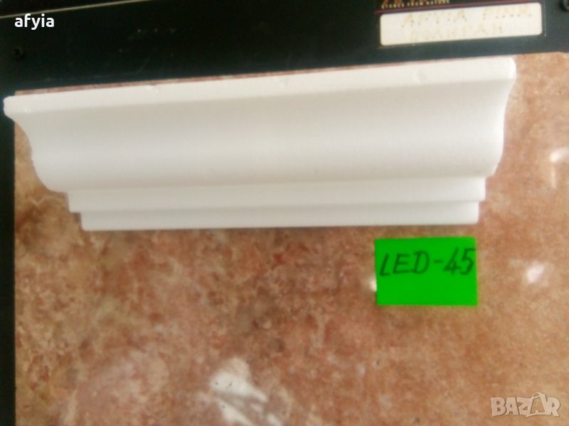 LED-45. Лепи се само към стената, малко под тавана. Сечение 6х5 см, с един жлеб за ЛЕД лентички отпред. Цена: 4,40 лв/м (2,25 €) или 8,80 лв. (4,50 €) за 1 профил (2 м). Останала наличност само 8 м.