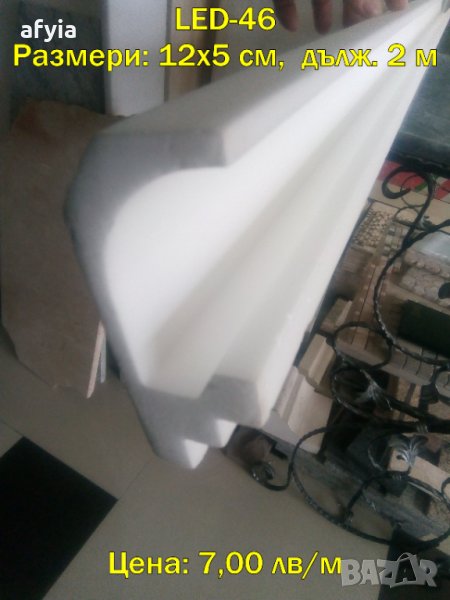 LED-46. Лепи се към стена и таван.Сечение 12х5 см, с един жлеб за ЛЕД лентички отпред. Цена: 7,00 лв/м (3,58 €) или 14,00 лв. (7,16 €) с ДДС за 1 профил (2 м). Останала наличност само 4 м.