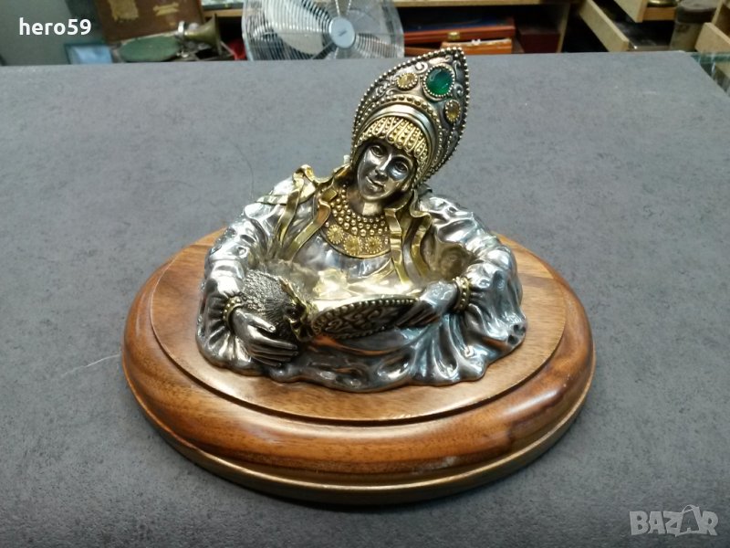 Красота,уникат!!!Здравейте,предлагам на аудиторията интересуваща се от Руското национално изкуство,да се наслади на тази изящна работа на един от големите майстори на Руските ювелирни изделия,класиран в петицата на Руските майстори на това изкуство,в която влизат майстори като Хлебников,Фаберже,Сазиков ,братя Грачови!Майсторът е пресъздал красивата руска жена от времето на властването на император Александър трети, с типичната за времето си носия,придържаща в едната си ръка кокошка а в другата огледалце!Изключително трудна за изработване фигура с инкрустирани полу скъпоценни камъни с позлата на някои детайли!Още веднъж ви пожелавам,да се насладите на тази уникална работа!Такава вещ реално се продава в големите аукционни къщи,но за мен е удоволствие, че имам възможността да ви покажа подобна вещ!Материалът е сребро/84/ което е видно и от снимковия материал,година 1888 год.Благодаря Ви за посещението на сайта ми!