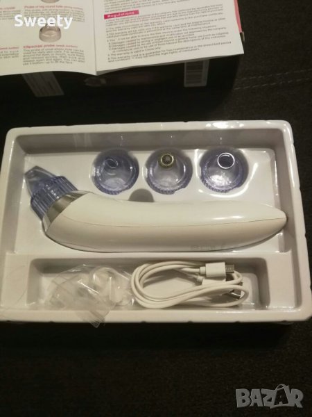 Уредът работи със собствена батерия. Има няколко сменящи се накрайника-за почистване на черни точки, за масаж, за пилинг на лице. Работи на различни степени. Удобен за почистване на лице .