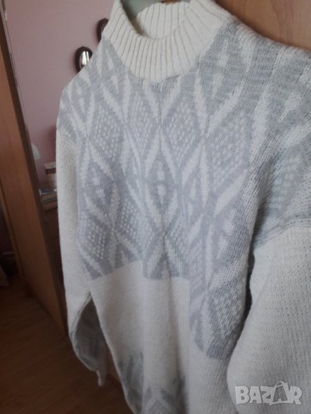 Зимен блузон, дълъг, цвят бял със светлосиви ромбоиди. Блузона е нов, размер S - М, унисекс. Отговарям на съобщения тук, изпращам с отстъпка в доставката с куриер с преглед и тест, или лично предаване в София.