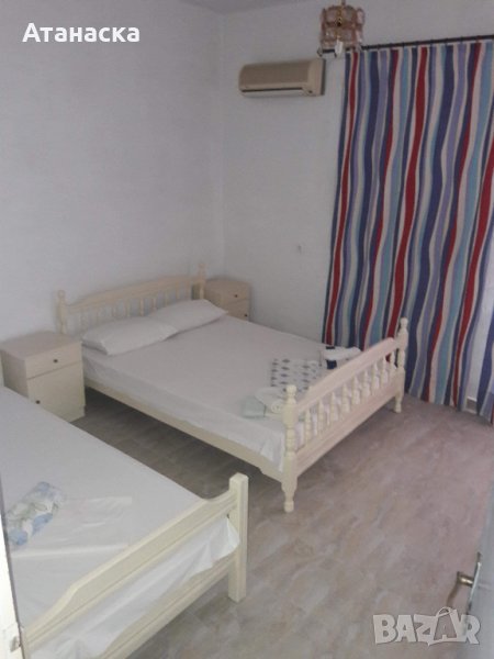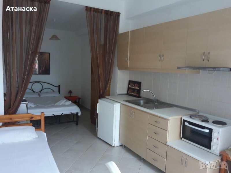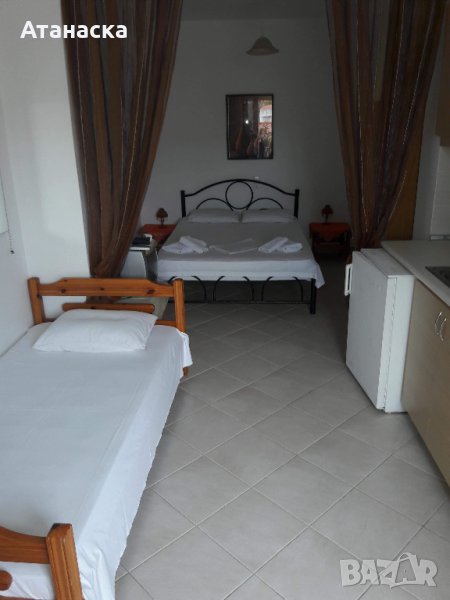 Гърция . Намират се на центъра . От централният плаж са на 50-70 м , от Атспас бийч на около 500-600 метра , а от най-големият плаж в началото на селото на около 200-250 м. Предлагат се гарсониера с 1 спалня и едно разтегателно легло за 3 човека и апартамент с 3 отделни стаи - двете са със спалня , а третата е със спалня и 1 единично легло за 7 човека , като има възможност да се спложат още подвижни легла . Гарсониерата има кухня и баня с тоалетна , климатик , Wi-Fi интернет , тераса с гледка към центъра и градина . В апартамента има кухня , 2 бани и тоалетни , климатик , Wi-Fi интернет , тераса с гледка към центъра и градина .