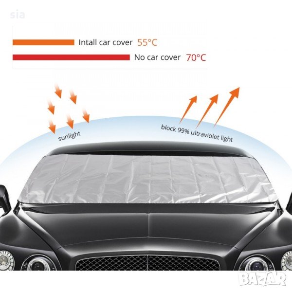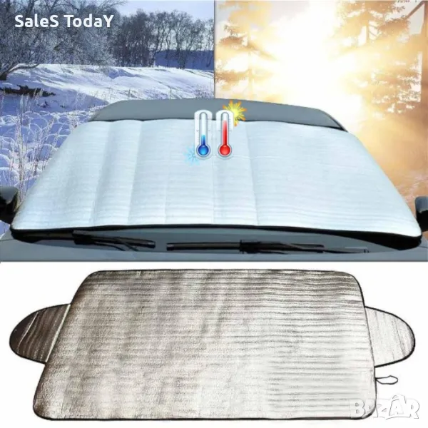 Универсалният термо сенник предпазва вашият автомобил през различните сезони. Поставя се от външната страна на предното стъкло. Може да се ползва и като постелка за лягане под автомобила. Лесен монтаж и демонтаж с двете уши които се защипват с предните врати на автомобила което спестява време и усилия.