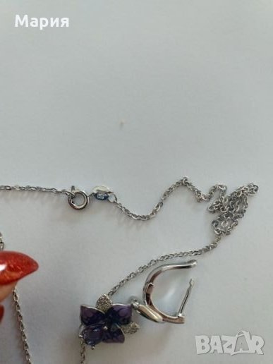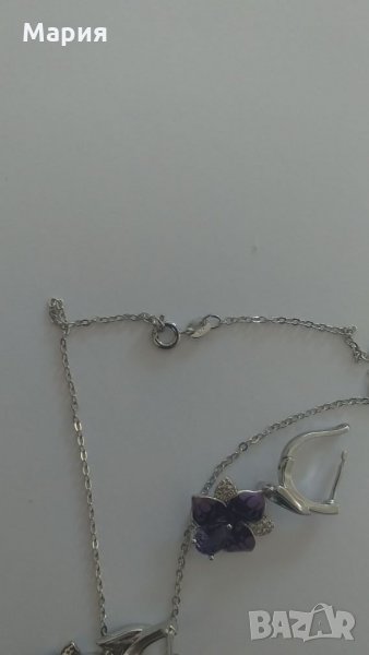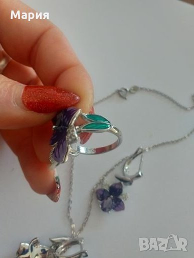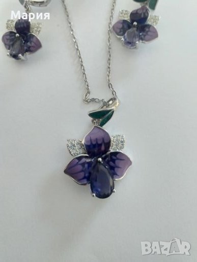 Изключителен сребърен комплект от 4 части - сребърен синджир, сребърна висулка, обеци във формата на големи лилави цветя, покрити с емайл и инкрустирани лилави . Проба на среброто 925. Пръстенът е малко продаден.