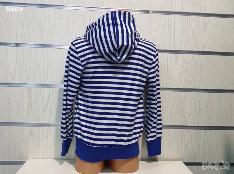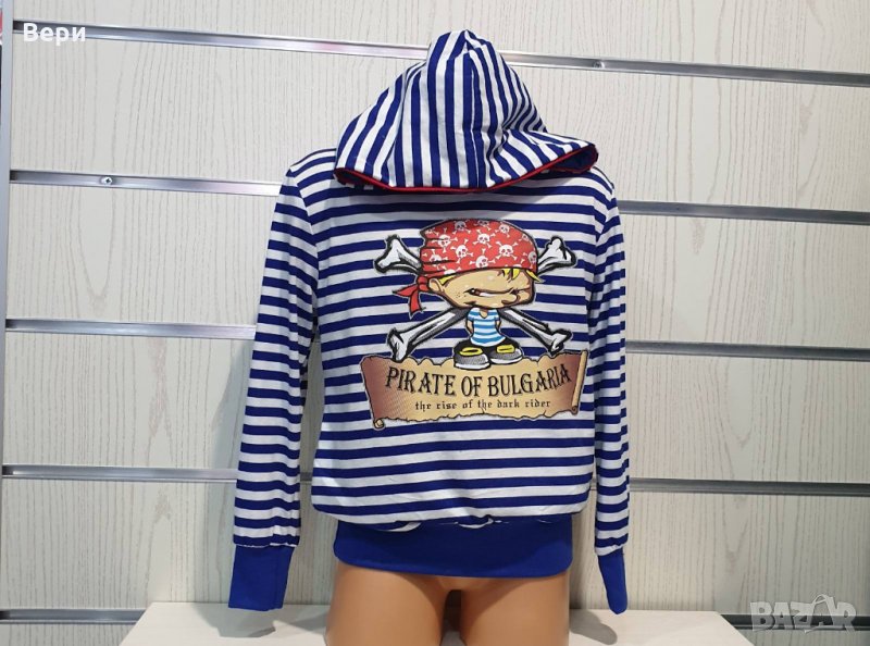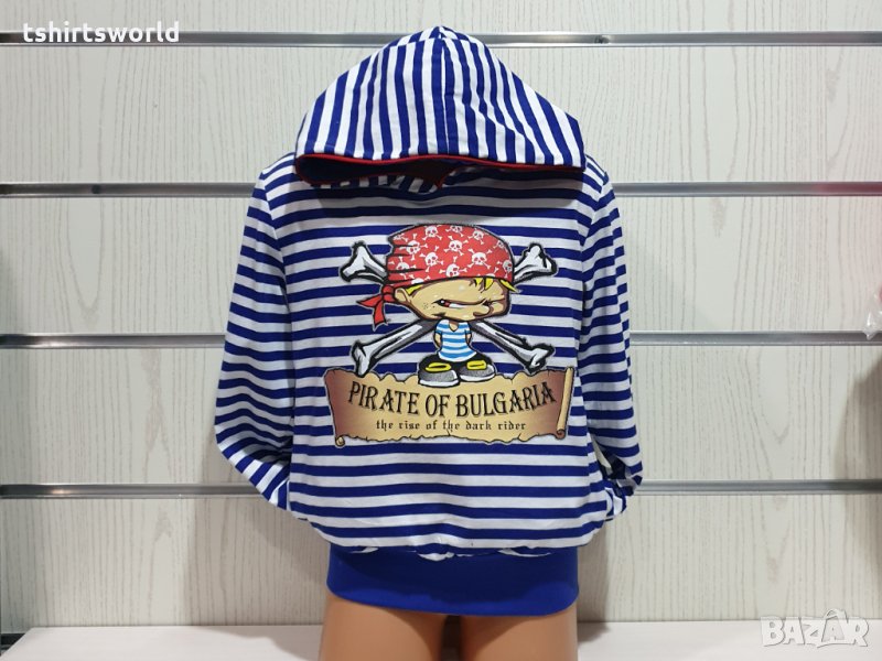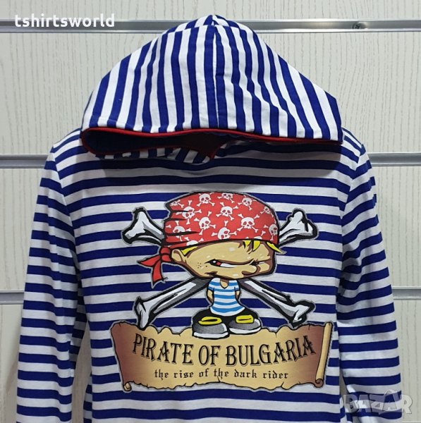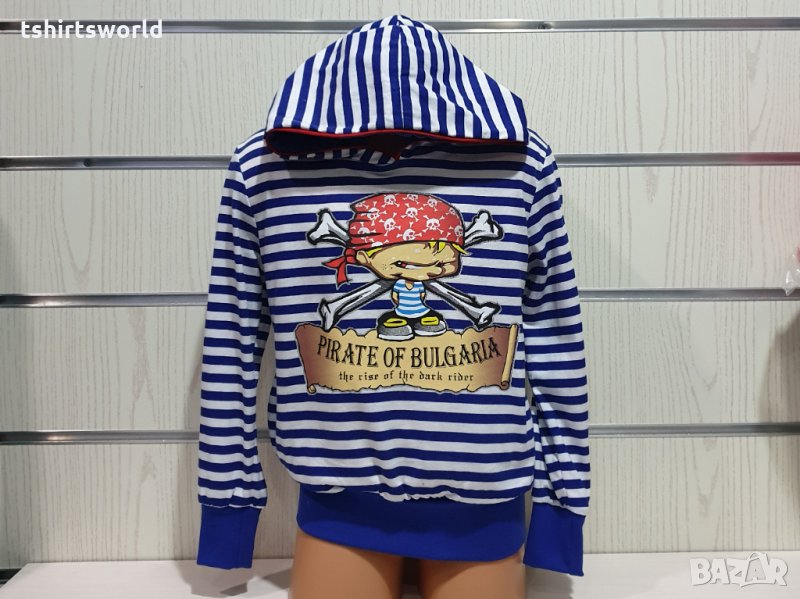 Нов детски суичър на класическо моряшко синьо и бяло райе с качулка, джобчета и трансферен печат PIRATE OF BULGARIA. Произведен в България от висококачествен 100% памук. Моделът е подходящ за пролетния и есенно-зимният сезон, има ластични маншети на китките и ханша, запазващи топлината. Свободната кройка го прави подходящ както за спорт, така и за ежедневно носене с дънкови панталони. Марката PRINTEX от години се слави със своите топли и качествени суичъри.