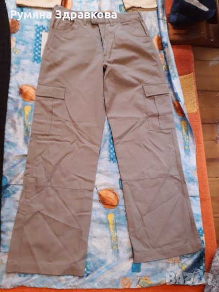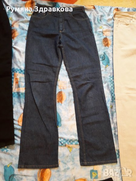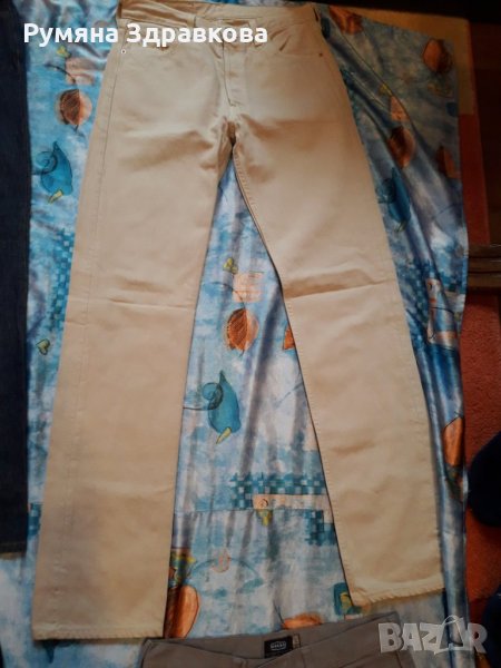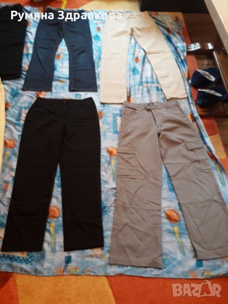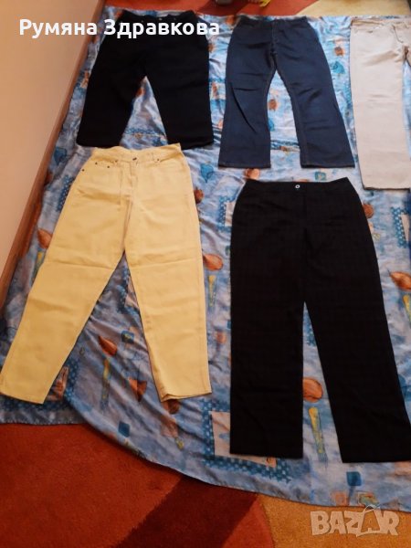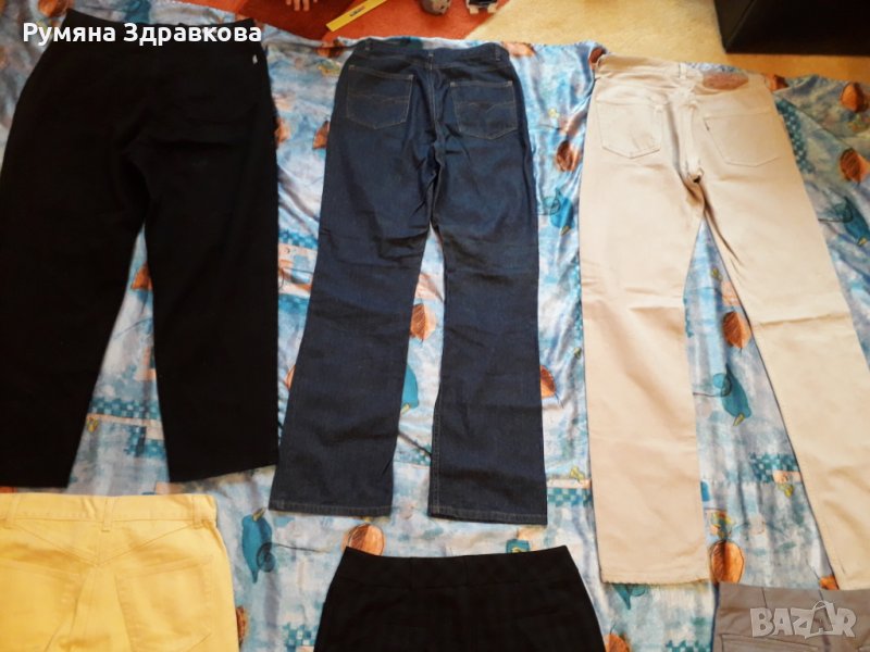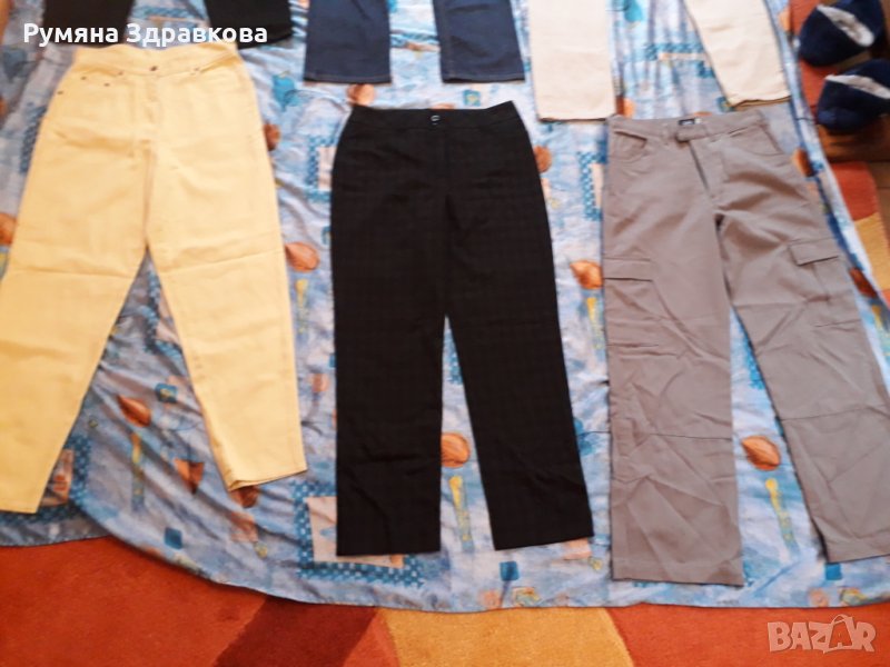 Панталоните са запазени, някои дори не са обличани. Бежовия е с марка Levi's, размер L. Размерите, които са написани на панталоните са както следва: черните дънки най-отгоре в ляво са 44 размер, сините до тях 36 размер, жълтите са продадени, черния панталон до жълтите 38 размер, сивия с джобовете XS, но според мен е поне М.