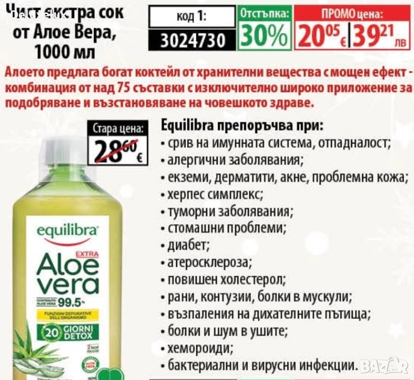 Equilibra сок Алое Вера Екстра съдържа 100% чист, неразреден сок, получен от подбрани листа на Aloe Vera Barbadensis VAR Miller (99,55 %), които са студено обработени и студено стабилизирани за максимална защита и запазването на оригиналните съставки на продукта. Антиоксидантите в Алое се борят с разрушителните „свободни радикали”. Смята се, че те са причинители на много болести, включително някои форми на рак, както и че ускоряват процеса на стареене. Сокът от Алое Вера съдържа богата гама от витамини (най-важните са антиоксидантите С и Е, както и бета каротина, който организмът преработва във витамин А) и минерали (магнезий, манган, цинк, мед, хром, калций, натрий, калий и желязо) включително и редкия витамин В12. Алое вера е и едно от малкото растения в света, източник на витамин В12. Това превръща сока от Алое Вера в незаменима хранителна добавка за всички вегетарианци. В сока се съдържа фолиева киселина, която е особено препоръчвана на всички жени, планиращи бременност; дълговерижни полизахариди, които укрепват имунната система; ензими – липази и протеази, които разграждат храната и допринасят за храносмилането, както и карбоксипептидаза – ензим, свързан с възпалителните процеси и др. Тази уникална напитка е и източник на седем от осемте незаменими есенциални аминокиселини, които са директно свързани с растежа на клетките и не се синтезират от организма.