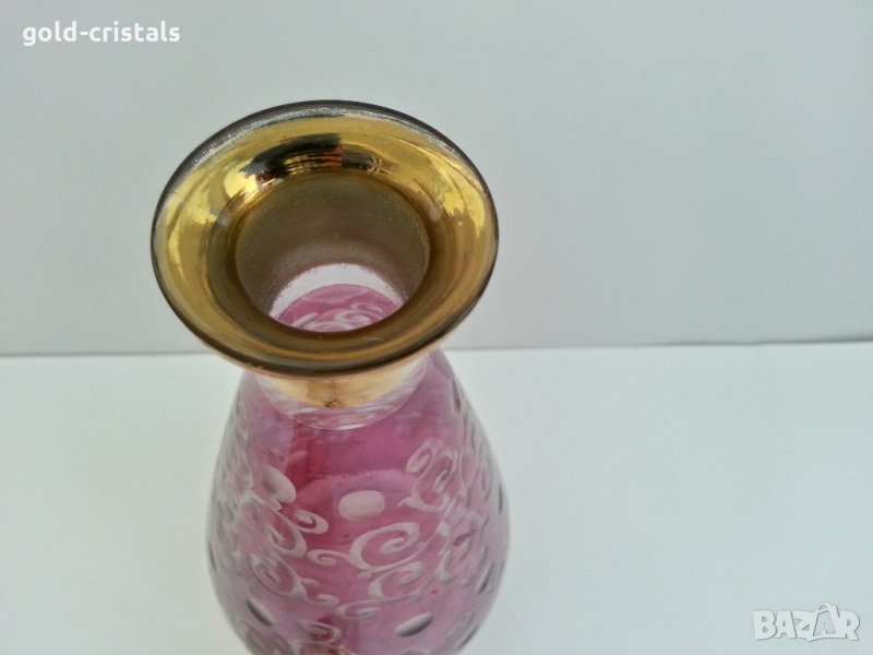 стара гарафа бутилка шише неизползвана с етикет бохемия цветно стъкло кристално стъкло с златен кант позлата ръчно гравирана ретро арт декор винтидж колекция стара старинна антикварни предмети обзавеждане за дома и семейството подходяща за подарък за ценители и колекционери