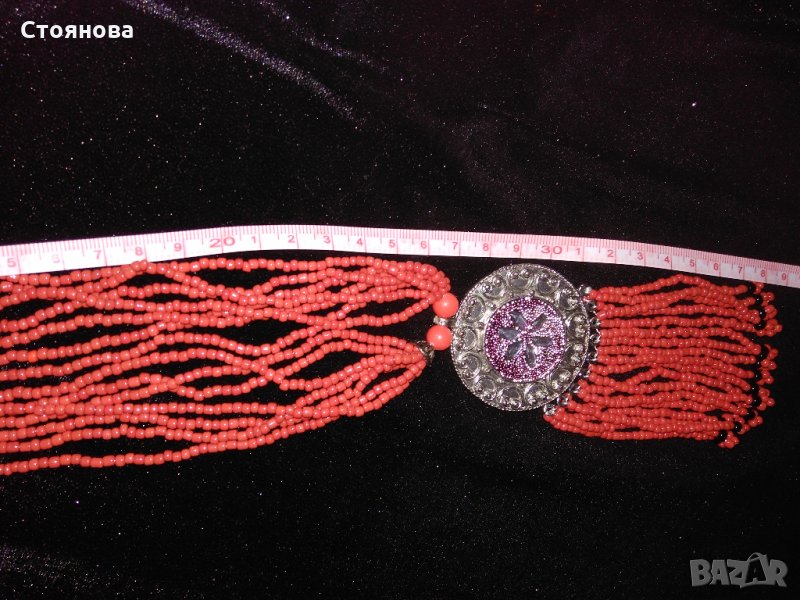 Продавам ефектно дамско червено колие с мъниста и камъни, размери показано на снимките - дължина от горе до долу 38 см., обиколка в горната част 52 см. - цена 10 лева.