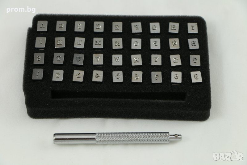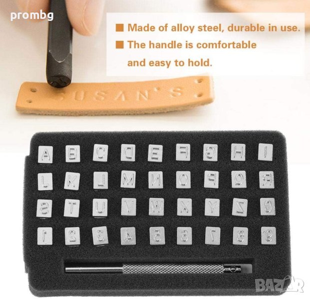 Практичен комплект за ръчно щамповане и персонализиране на изделия от кожа, дърво, пластмаса и други меки материали. Комплектът включва метални печати с букви и цифри, които позволяват лесно изписване на имена, инициали, серийни номера или декоративни надписи върху изделия като: кожени колани; портфейли; чанти; гривни; кожарски изделия и аксесоари.