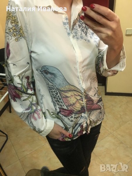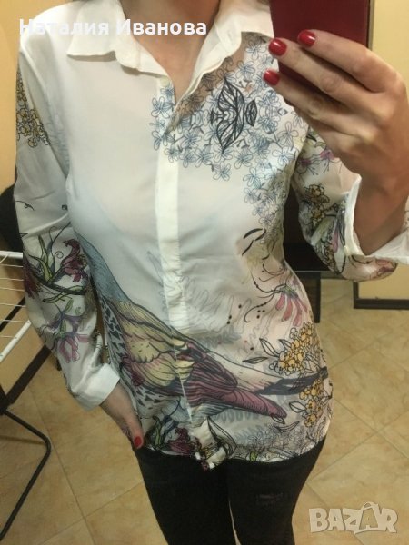 Продавам дамска риза с красиви рисунки по нея , с дълъг ръкав , от лека материя ,без забележки по външния вид . Ризата не се разменя за друга стока.9