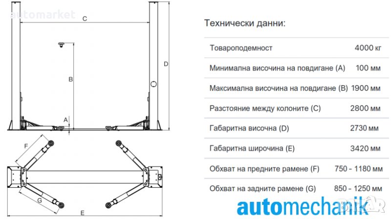 Товароподемност: 4000 кг. Подемниците са чисто нови! Конструкция от 18мм висококачествена стомана (на петите). Гарантирано най-добрата цена за нов подемник в страната! Директен вносител на подемници от Европа. Ние сме единиственият вносител в страната, който предлага пълна гаранция от 12 месеца и реакция за сервиз и монтаж до 24 часа. Извънгаранционен сервиз на достъпни цени. Винаги налични подемници и части на склад! . Продават се в България повече от 30 години! Над 60 000 продадени и работещи подемника на територията на България, над 600 000 за цяла Европа. Изключително качество без компромис! Опция за изгоден лизинг. Ако намерите по-добра цена от тази в България, ще ви направим такава с 10% по евтина от намерената от вас.