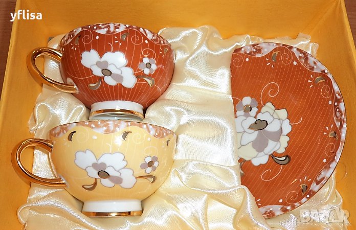 красиви и качествени комплекти за двама - чаши с чинийки - 4 части с цялостен декор и пищно злато. Подходящи за мъж и жена, двойка, семейство, Коледа, Нова година и всички поводи и празници.