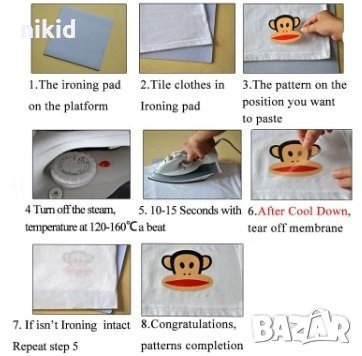 Поставете върху желана дреха -БЕЗ да премахвате защитно фолио , покрийте с парче плат,след което с топла ютия 120-150 градуса за 10-15 секунди минете отгоре ,след което отлепете защитното фолио.