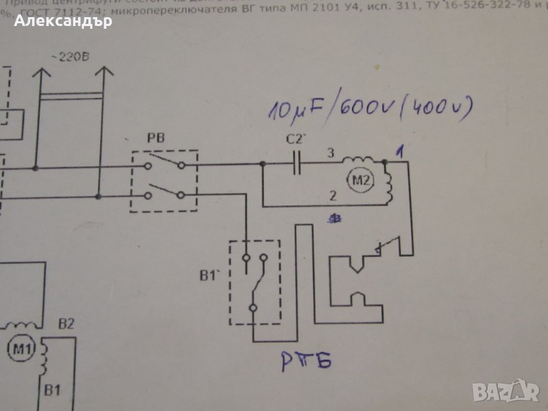 Сделано в СССР /без икономия на меден проводник/. За центрофуга- може да работи вертикално /радиално-аксиални лагери/. Вала излиза и от долната страна /привод за помпа; вентилатор/. Прилагам схема на свързване. Кондензатора 8-10мкф. е работен, затова трябва да бъде за напрежение, не по-малко от 400V. Желателно е да се включи с термична защита /може да се използва българска РТБ за ток 2А/.