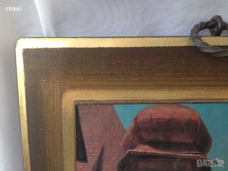 - монтирана върху масивно дърво, оформено и като рамка, с прекрасна ръчно направена позлата и подходящи пастелни цветове, които идеално пасват на старинността на тази антична картина,