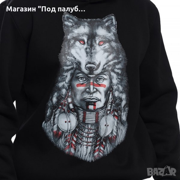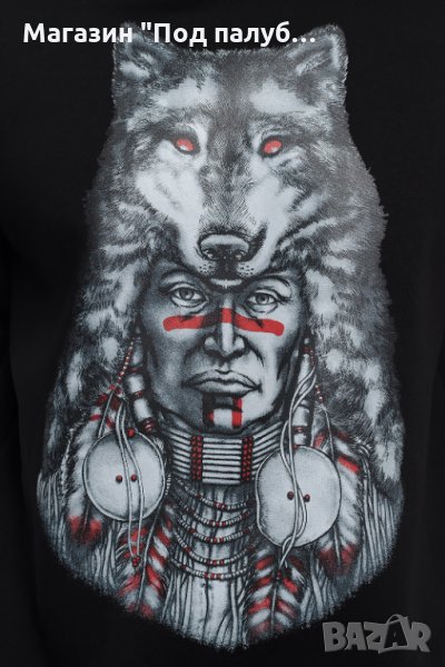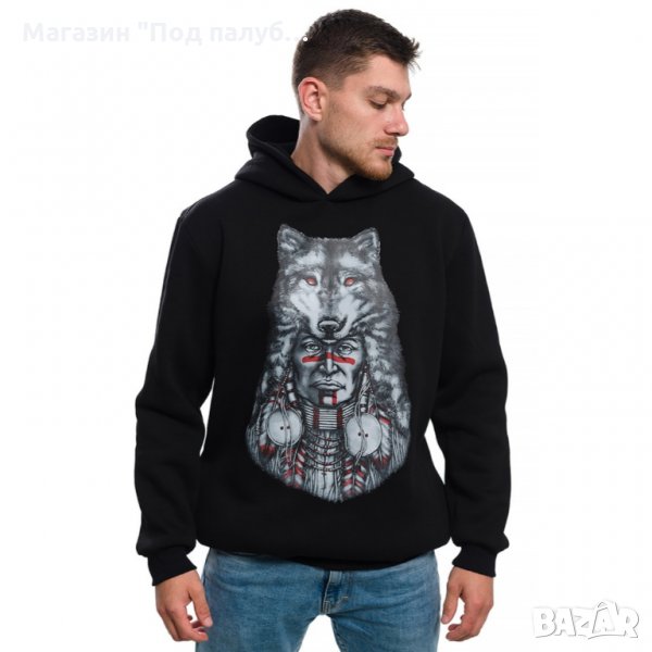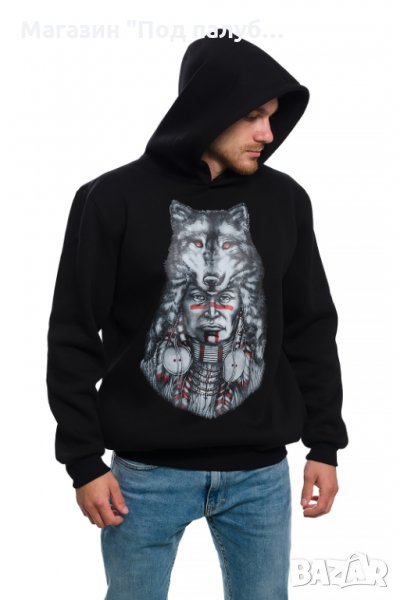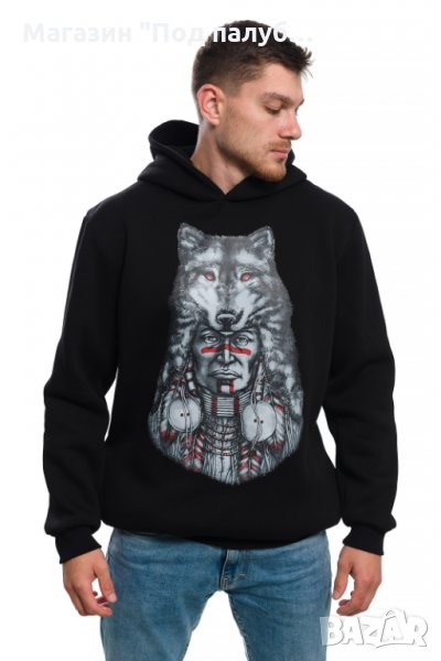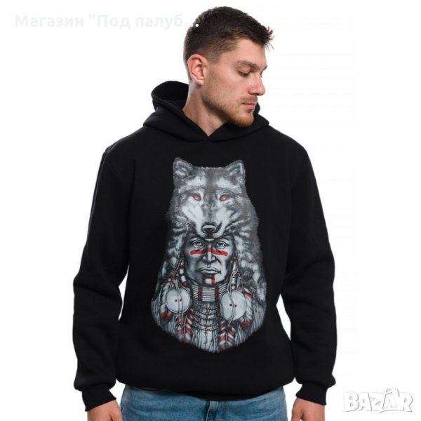 Страхотен нов мъжки суичър в черен цвят с качулка, две джобчета и трансферен печат Вълк индианец. Произведен в България от висококачествен 100% памук - триконечна пенирана вата с кардировка, което го прави изключително топъл и желан от нашите дългогодишни клиенти. Моделът е подходящ за пролетния и есенно-зимният сезон, има ластични маншети на китките и ханша, запазващи топлината. Разполага с мека подплата и два отворени джоба в страни. Свободната кройка го прави подходящ както за спорт, така и за ежедневно носене с дънкови панталони. Марката PRINTEX от години се слави със своите топли и качествени суичъри.