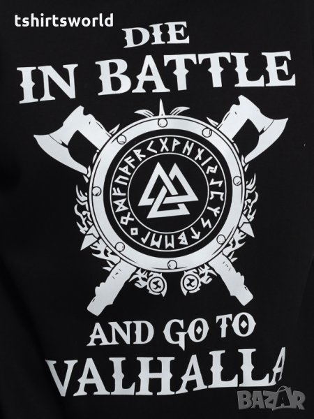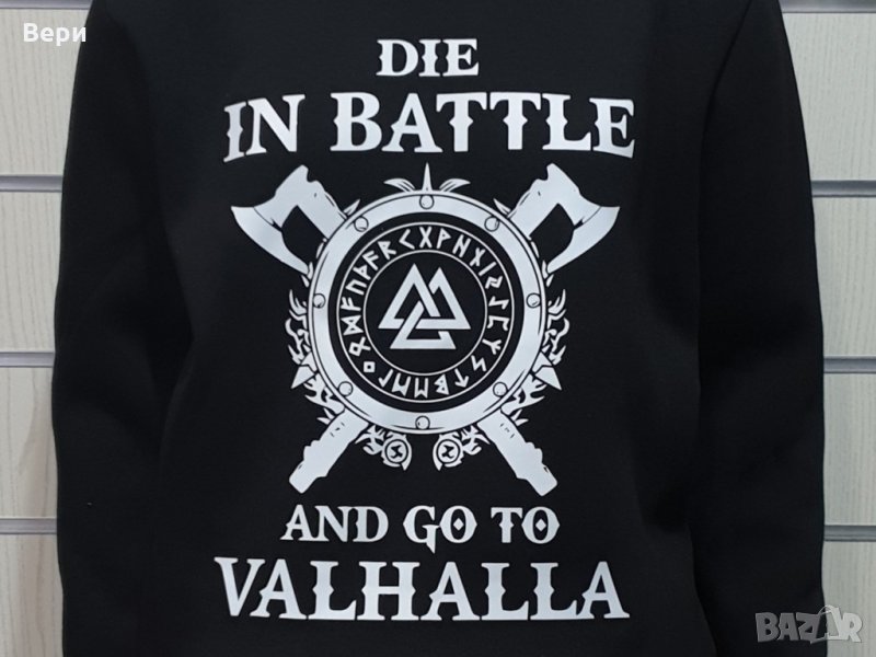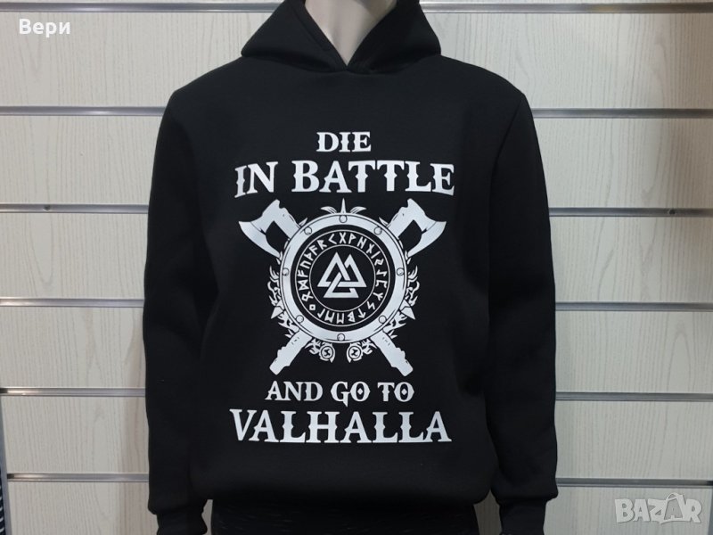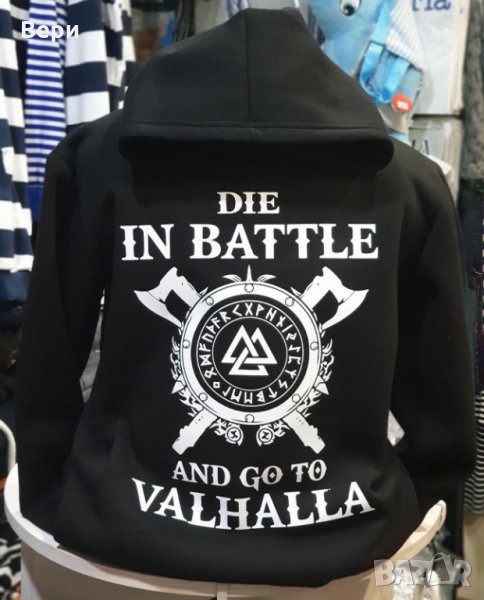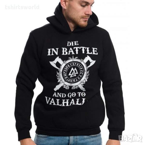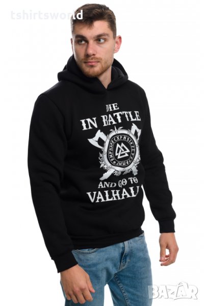 Страхотен нов мъжки суичър в черен цвят с качулка, две джобчета и трансферен печат на сериала Викинги - Die in BATTLE and go to VALHALLA, символираща смелостта и силата на викингите. Тематичният суичър ни връща във времето, когато хората не са се страхували да умрат в битка, а дори напротив за тях е било гордост.