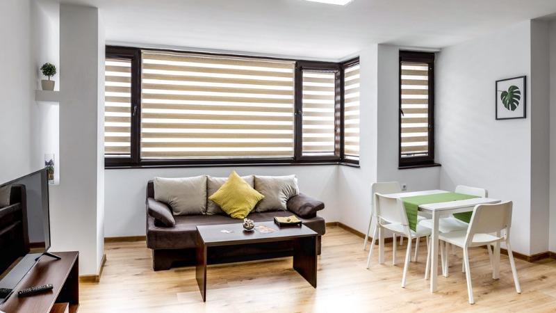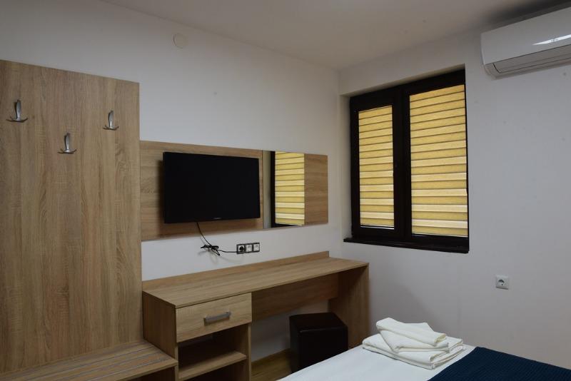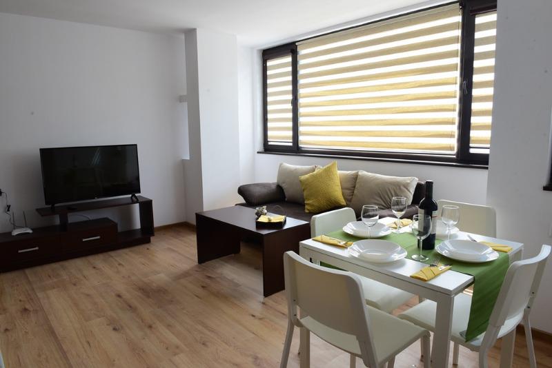 Имотът се предлага напълно обзаведен с чисто нови мебели и ел.уреди. LED телевизори. Кухните са оборудвани с хладилник, котлони, аспиратор,