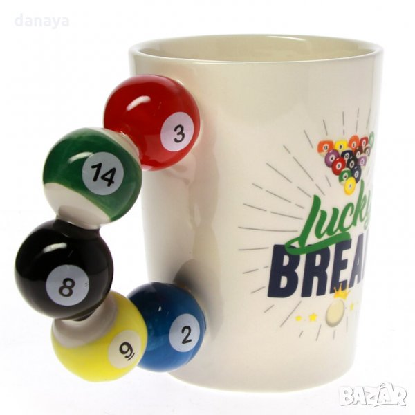 Нестандартна, цветна и забавна чаша с надпис Lucky Break и дръжка с форма на билярдни топки. Изненадайте приятно ваш приятел или обичан човек с тази щура чаша. Чудесен подарък за тези, които обичат играта билярд.