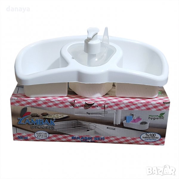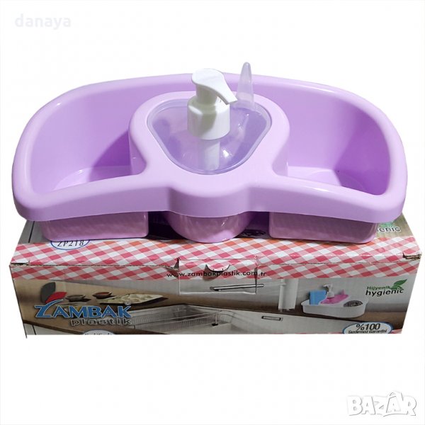 органайзер за мивка с вграден диспенсър за веро или друг препарат. С отделено място за бързо съхранение на пръстените от ръката.
