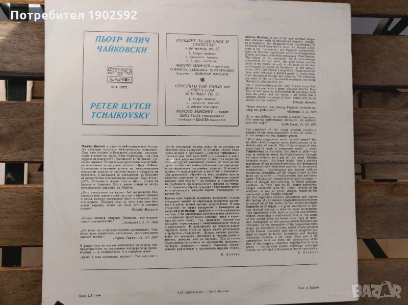 Концерт за цигулка и оркестър в ре мажор - изп. Минчо Минчев ВСА 10275 → Обява 27773536
