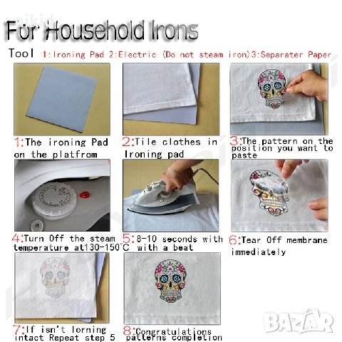 Поставете върху желана дреха -БЕЗ да премахвате защитно фолио , покрийте с парче плат,след което с топла ютия 120-150 градуса за 10-15 секунди минете отгоре ,след което отлепете защитното фолио.