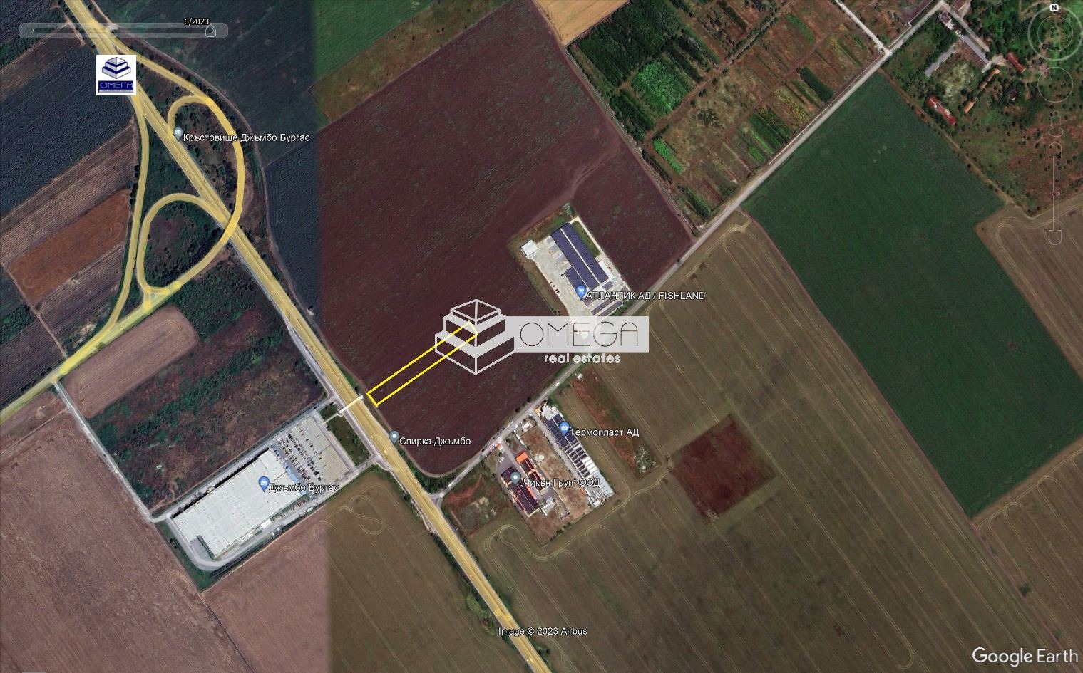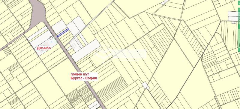 ОМЕГА продава парцел с 20м лице на главен път Бургас - София находящ се срещу магазин 'Джъмбо'. Парцелът е с площ от 3,8дка. Намира се в близост до комуникации. Подходящ е за промишлено строителство, складове, логистични бази и други.