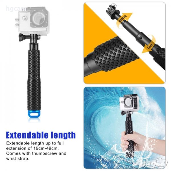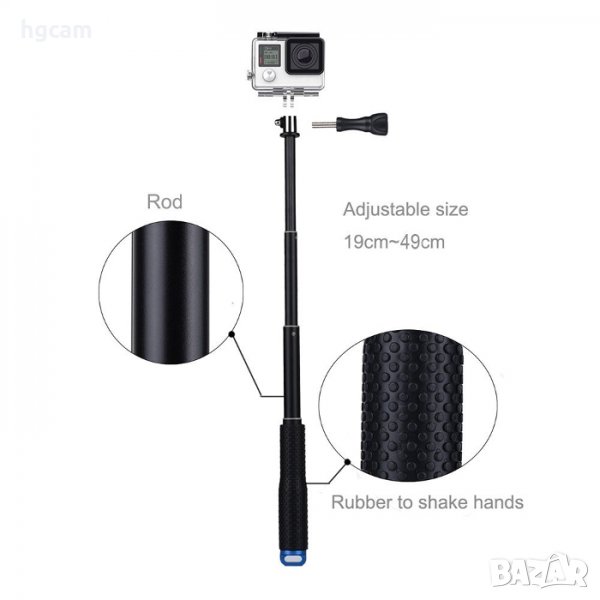 Тази телескопична пръчка/монопод/селфи стик е подходяща за ползване с екшън камера и телефон.