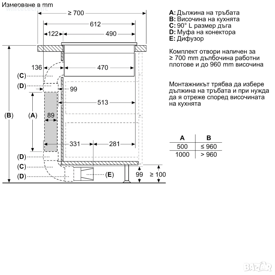 – Монтажът е възможен както в островна, така и в стенна конфигурация. – Продуктът отговаря на изискванията на теста за пламък с игла (съгласно IEC 60695-5-11), на клас на запалимост V2 (съгласно UL94) и на клас B1 за строителни материали (DIN 4102-1). Стартовият комплект HEZ9VRUD0 за недифузна рециркулация също отговаря на тези стандарти. – Максималната дълбочина на вграждане е 223 мм под стъклото за уреди, монтирани отгоре, и 227 мм за уреди, монтирани на едно ниво. – Уредът трябва да бъде свободно достъпен отдолу (напр. за достъп до долния предпазен колектор за течност). – Не е необходим фалшив под под готварския плот с вградена вентилационна система downdraft. Чекмеджетата и/или рафтовете в подовия модул трябва да могат да се демонтират. Задният панел на подовия модул може да се запази – необходим е само изрез за изхода за въздух (позицията и размерът могат да се вземат от инструкциите за монтаж). – Стартовият комплект „Plug ‘n Play“ HEZ9VRUD0 за недифузна рециркулация изисква вертикален отвор от мин. 25 mm зад задния панел на мебелите. За идеална производителност се препоръчва 50 mm. -Минималната дебелина на работния плот е 16 мм за уреди, монтирани отгоре и на едно ниво, при стандартната система за монтаж. Монтажът в още по-тънки плотове е възможен и с резервната част: съдържание 626792. – Общото тегло на уреда е 26 kg – носещата способност и стабилността, особено в случай на много тънки плотове, трябва да се поддържат с помощта на подходящи подконструкции. Общото тегло на уреда и спецификациите за структурна цялост на производителя на работния плот трябва да се вземат под внимание. – Стартовият комплект „Plug ‘n Play“ HEZ9VRUD0 за недифузна рециркулация дава възможност за лесен и бърз монтаж и може да се планира при всички дълбочини на работния плот ≥60 cm. За канални инсталации – при канално извличане (HEZ9VEDU0), както и при напълно или частично канална рециркулация (HEZ9VRPD0) – е необходима дълбочина на работния плот ≥70cm. – При частично канални и неканални инсталации за рециркулационно отвеждане на въздуха в зоната на цокъла трябва да се спазва отвор за обратен поток от ≥ 400 cm². Отворът може да се реализира чрез изходящи решетки, ламелни решетки или леко скъсени цокли в зависимост от асортимента на производителя на кухненско обзавеждане. – Достъпът до изхода за въздух от задната страна на уреда се осъществява директно с помощта на мъжки плосък канален елемент (DN 150). – Устойчивият на капки вентилатор позволява по-дълги и по-сложни въздуховоди с дължина до 8 м с три 90° дъги, като запазва достатъчна производителност. – При инсталиране на аспиратор с канално отвеждане и коминно отделение за захранващата линия на уреда трябва да има подходящ предпазен ключ. Това не се изисква при конфигурации с рециркулационно отвеждане на въздуха. – При конфигурация на канално отвеждане трябва да се монтира еднопосочна клапа (или сифон за обратен поток) с максимално налягане на отваряне 65 Ра.
