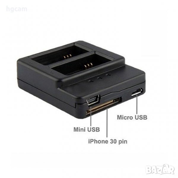 Това зарядно устройство ви дава възможност да зареждате едновременно 2бр. батерии(НЕ са включени в комплекта) за спортна видеокамера Hero 3/3+. Към зарядното НЕ е включен usb кабел или адаптер 220V за зареждане. Може да ползвате micro, mini usb кабел от комплекта на вашата камера или смартфон или 30 пинов кабел за Apple.