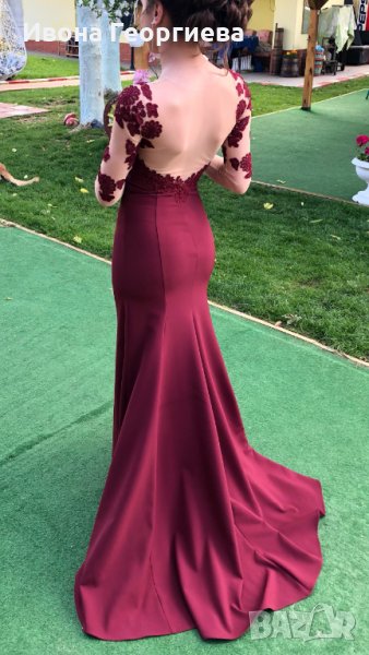 Шита по поръчка от жоржет, дантела и тюл. Отговаря на размер XS-S. По-стеснена в талията. Без следи от употреба! Цвят бордо!