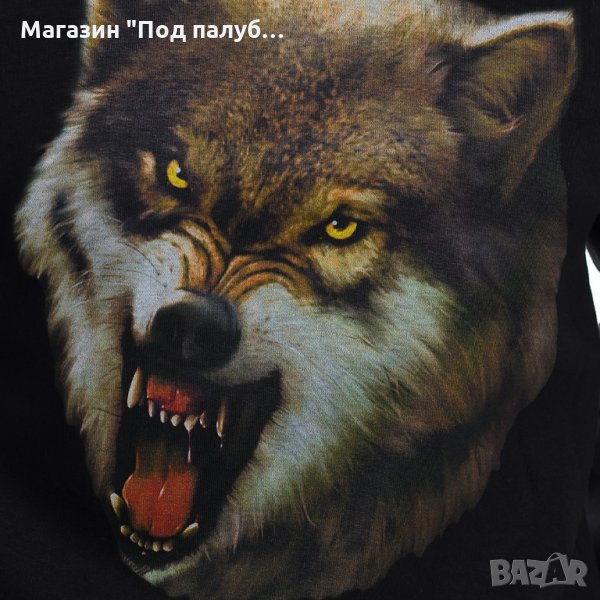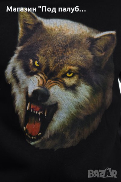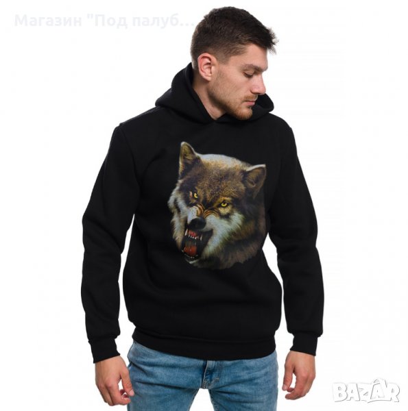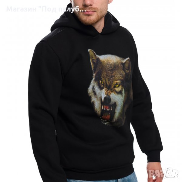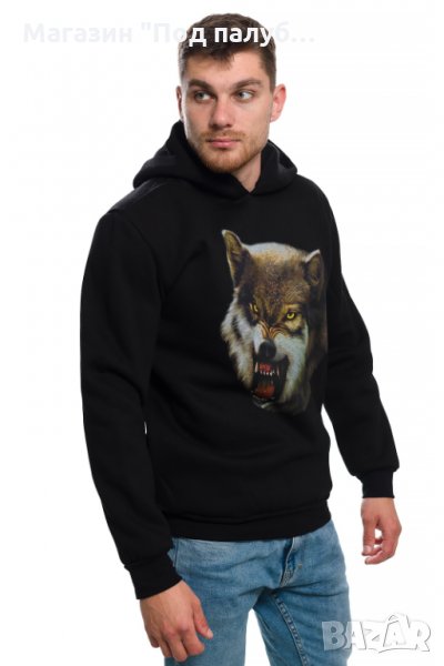 Страхотен нов мъжки суичър в черен цвят с качулка, две джобчета и дигитален печат Страшен Вълк с размер на печата 30х38см. Произведен в България под марката PRINTEX от висококачествен 100% памук - триконечна пенирана вата с кардировка, което го прави изключително топъл и желан от нашите дългогодишни клиенти. Моделът е подходящ за пролетния и есенно-зимният сезон, има ластични маншети на китките и ханша, запазващи топлината. Разполага с мека подплата и два отворени джоба в страни. Свободната кройка го прави подходящ както за спорт, така и за ежедневно носене с дънкови панталони. Марката PRINTEX от години се слави със своите топли и качествени суичъри.