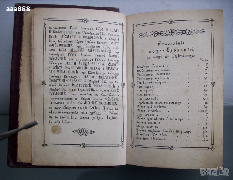Старинен молитвослов, печатан с благословията на Светейшия Всероссийски Синод през юли 1860 год. по времето на император Александър II, когато борбата срещу гръцкото духовенство по нашите земи начело с Неофит Бозвели и Иларион Макариополски се засилва. В резултат османското правителство възстановява Българската патриаршия под името „Българска екзархия“ с ферман на султана, обнародван на 28 февруари 1870 г.
