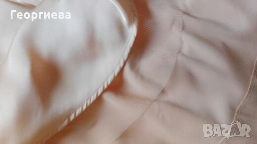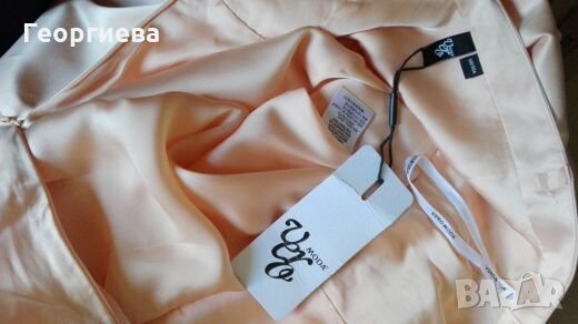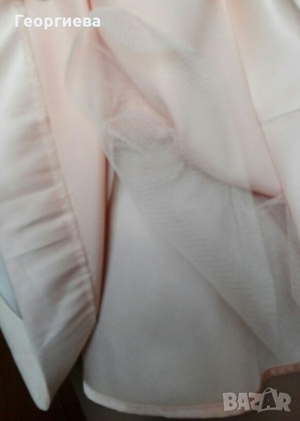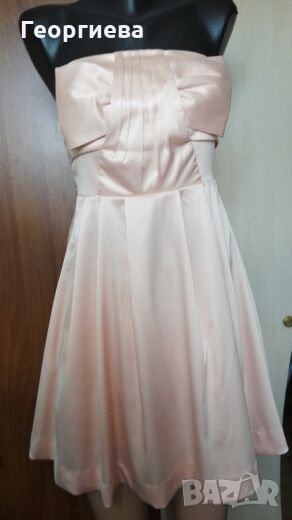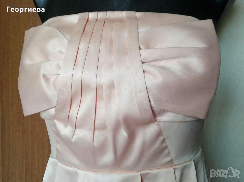 Роклята е цвят пудра.Много кокетна - полата стои настрани, защото е подплатена с двупластов тюл и плат.Роклята е къса - над коляното (зависи от фигурата и височината).Материята е много гладка и еластична - сатен.