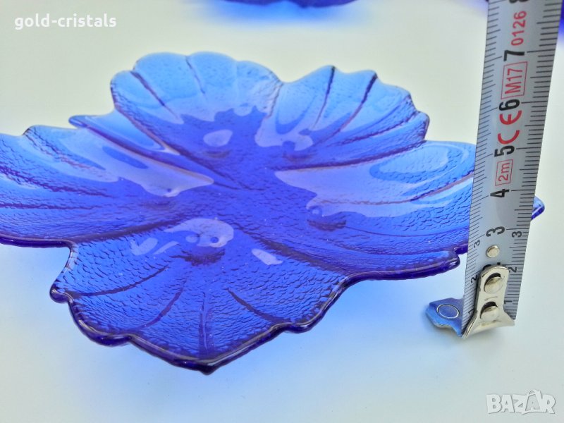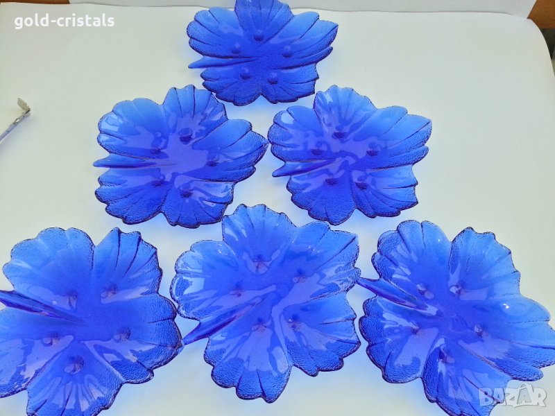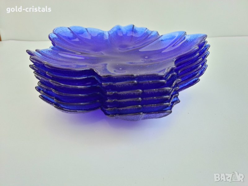 кристални чинийки син кобалт кристално цветно синьо кобалтово стъкло неизползвани с форма на листо сервиз комплект сет лот ретро арт декор винтидж колекция стари старинни антикварни предмети обзавеждане за дома и семейството подходящи за подарък за ценители и колекционери за десерт сладко торта и др