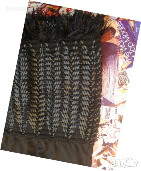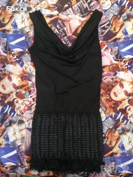 Малка черна ефектна рокля, къса. Горна памучна част, падащо деколте, долната част е еластична, покрита с пакети и перца и кожени нишки.