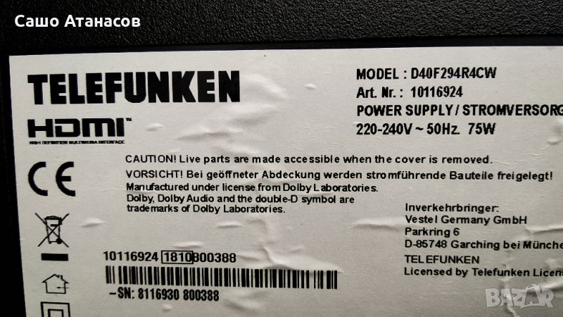TELEFUNKEN D40F294R4CW със счупена матрица (панел VES400UNDS-2D-N12 )