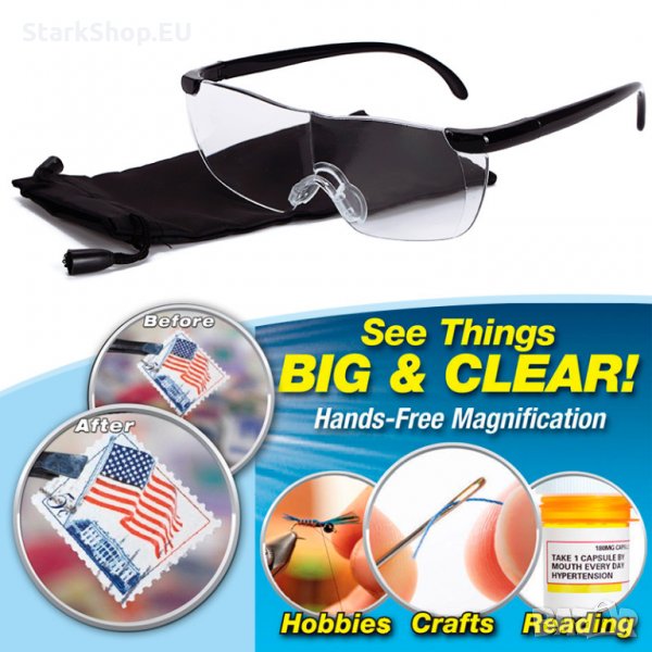С тези очила получавате мигновено увеличен образ със 160 %. Не е необходимо да ги държите, просто ги слагате на главата и повече не се занимавате с тях. Те са големи и могат да се сложат и над Вашите очила. Идеални при шиене, четене, запояване, разглеждане на малки обекти.