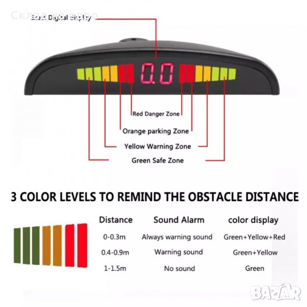 6. 0-30см - опасна зона - опасност - зелен + жълт + червен LED / LCD.