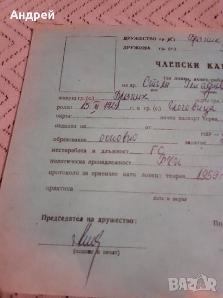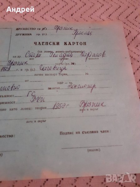 Стар членски картон за Ловец,Риболовец → Обява 27875669