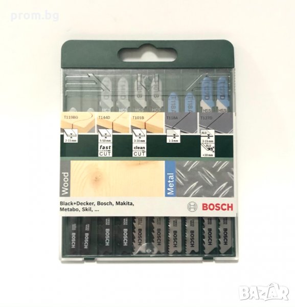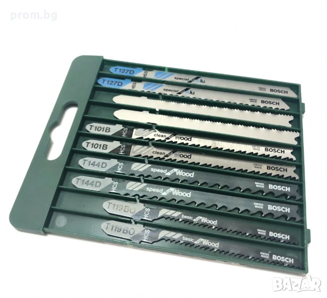Bosch комплект ножчета за прободен трион 10 броя. Внос от Германия. За бързо рязане на дърво и метал; Издръжливи и здрави. Подходящи за прободни триони от всички марки електроинструменти с монтаж на Т-образна опашка. Използват се за иглолистна дървесина, ПДЧ, дървени плоскост, покривни летви, шперплат, тънка ламарина, алуминий, цветни метали, тръби и профили. Комплектът съдържа: