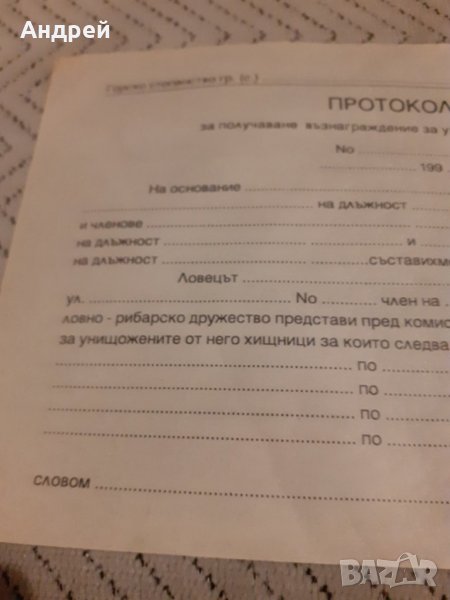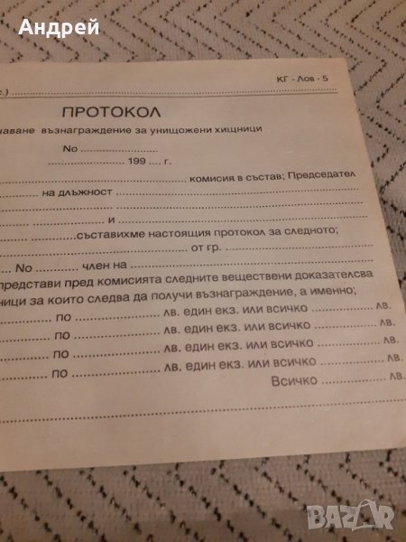 Бланка Протокол за възнаграждение за унищожени хищници от соца!