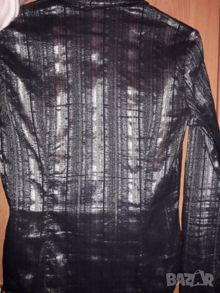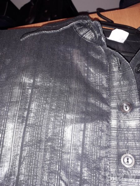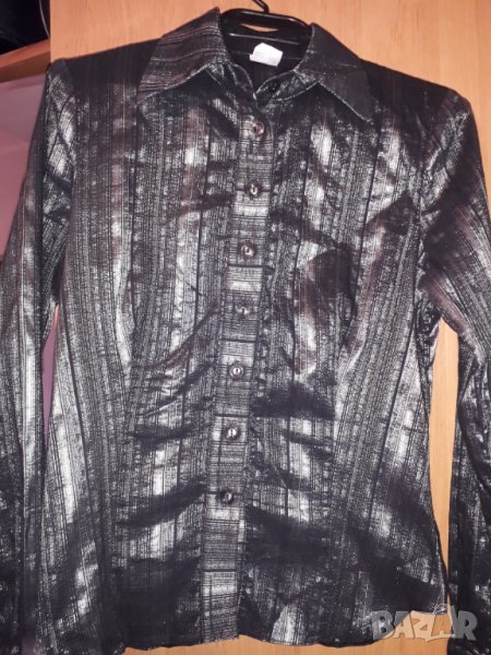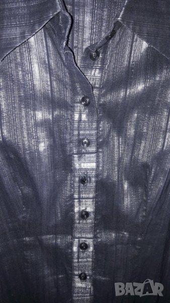 Дамска риза с дълъг ръкав с копчета, еластична сатенирана материя, леко вталена, цвят тъмносиво графит на райета. Размер М.