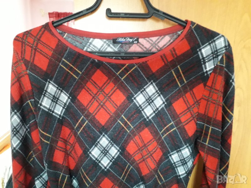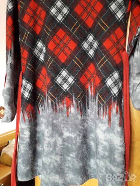 Дамска рокля с коланче, роклята е по-къса и може да се облича като туника с клин или по плътен чорапогащник, цвят комбинация преобладаващо сиво и червено на ромбоиди, трикотажна плътна материя, отстрани на ръкава има копче за набиране на ръкава. Мярка М или №44-46 българска номерация. Гръдна обиколка 44 см отпред /или обиколка 88 см, но има еластичност до 48 см /96 см/, дължината е 84 см. Отговарям на съобщения тук, изпращам с куриер с отстъпка, или лично предаване в София.