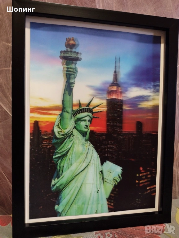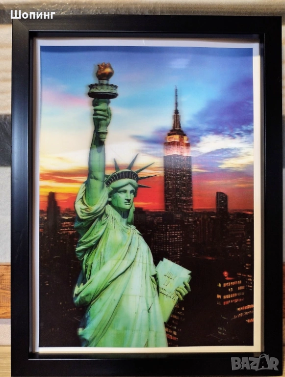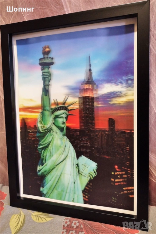 Модерна Чисто нова стерео 3D картина Статуята на Свободата (Ню Йорк). Размер: 30/40см. В рамка - дървена с пластмасов гланциран обков.