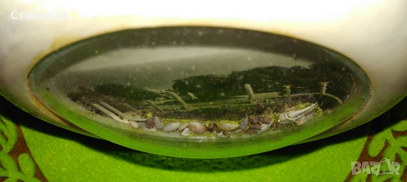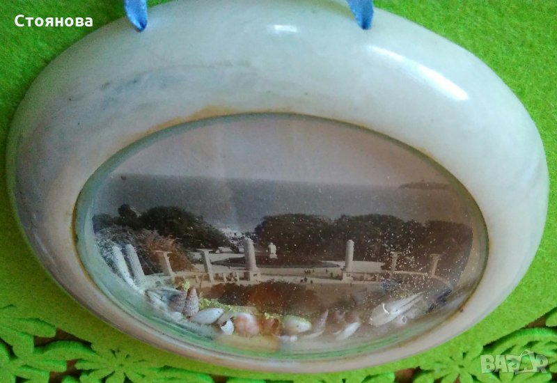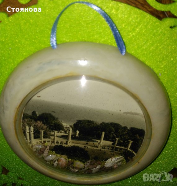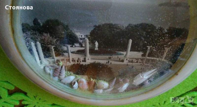 Сувенир от 60-те, 70-те години на ХХ век със снимка - изглед от централния вход на Морската градина на град Варна и декорация - естествени мидички и пясък, в много добро състояние.Цена 12 лева.