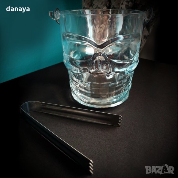 Голяма стъклена ледарка с форма на череп. Ледарник, съд за лед с метална щипка и допълнителен аксесоар метална дръжка. Ледарника е с вместимост около литър и в нея може да поставите бутилка вино да се изстудява в леда. Внушитена форма, дебело стъкло. Предлага се в кутия, подходяща за подарък.