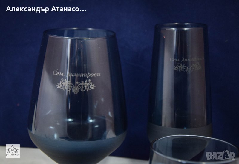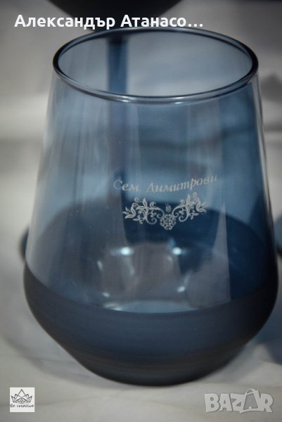 Лазерно гравирани стъклени чаши в син цвят с матова основа → Обява 27994799