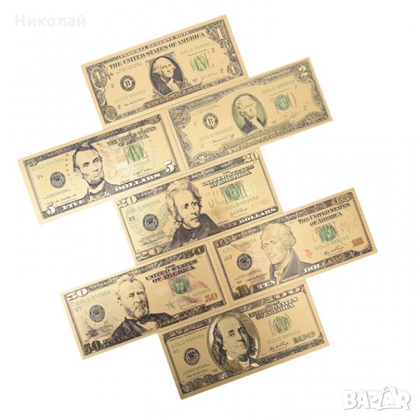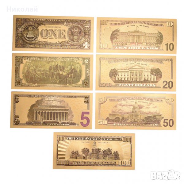 Златни долари доларови банкноти Комплект 7 бр. долара 1, 2, 5, 10, 50 и 100 златен долар златни пари